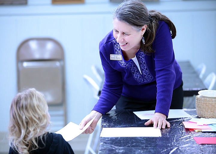 Director of Education for the Hockaday Museum of Art Kathy Martin hands out supplies to young children at the Preschool Art Adventures program on Tuesday, February 3, in Kalispell. (Brenda Ahearn/Daily Inter Lake)