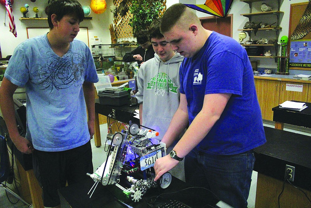From left to right; J.D. Booker, Ryan Teeter and Steven Lowry check their robot before packing it up for the trip to Missoula last week.