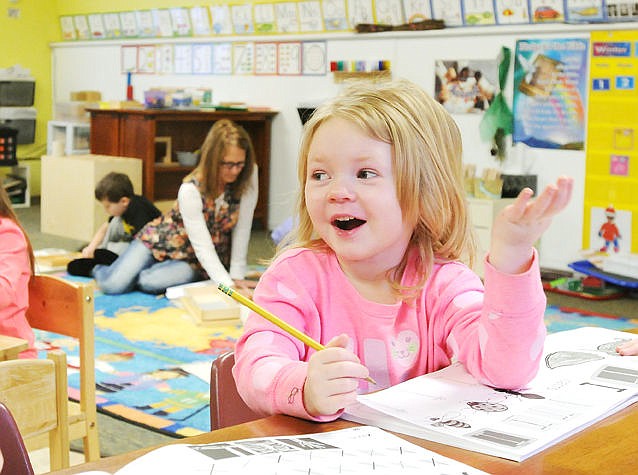 Abby Baldwin laughs as she works on her worksheet at the Stillwater Christian Montessori Preschool on Wednesday. (Aaric Bryan/Daily Inter Lake)