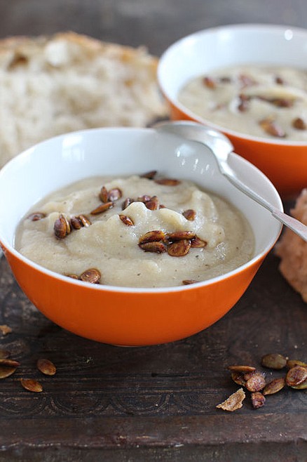 And it couldn't have been easier. A simple 8-ingredient creamy soup that actually contained no cream. Or any dairy product. Yet it was thick, rich, savory and just a little sweet. It cooked in less than 30 minutes and took only about 10 minutes prep time. For a salty, crunchy contrast, I topped the soup with tamarai-toasted pepitas (pumpkin seeds). You could buy them, but they take only a couple minutes to make.