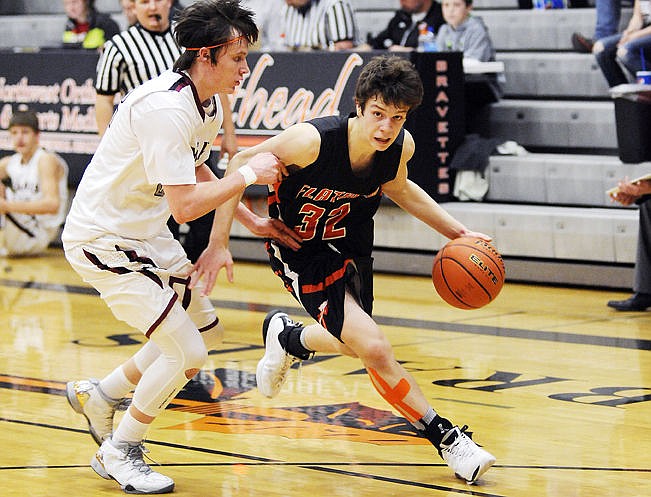 Flathead’s Tyler Johnson drives past Helena High’s AJ Kanthack during the third quarter of Friday’s Western AA boys basketball game at Flathead High School. Johnson, a freshman, finished with 16 points. (Aaric Bryan/Daily Inter Lake)
