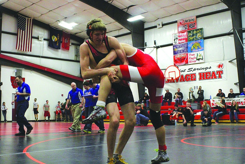 Savage Horsemen senior Russell Kujala looks to take down an Arlee opponent during last weekend's mixer in Hot Springs.