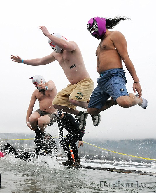 A group of the Flying Penguins team jumps into Whitefish Lake during the Penguin Plunge on Saturday. The Flying Penguin team raised the most money for the event. They raised nearly $7,000 for the Special Olympics. (Aaric Bryan/Daily Inter Lake)