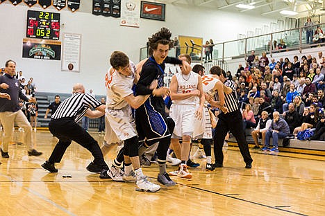 With 2:11 left in the game and Post Falls with possession of the ball, things got a little testy, but an incident was over nearly as quickly as it began just inside the 3-point line toward the stands of the visiting Coeur d'Alene fans. Post Falls senior post Jake Blakney had the ball knocked away from him by Joey Naccarato. Anderson dove and knocked the ball to McCullough, then Daniels fought for the ball and forced a jump ball and a whistle by an official. As Tony Naccarato tried to pick up Daniels off the floor, Dalton Thompson grabbed Tony Naccarato ... and after a brief skirmish, the ball was awarded to the Vikings.
