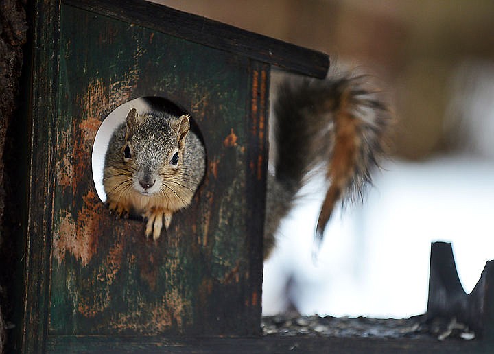 A curious squirrel pokes its head out from shelter during Monday's rain shower on February 9, in Kalispell. (Brenda Ahearn/Daily Inter Lake)
