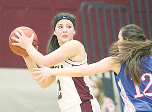Aurora Becquart looks to pass in second quarter with Bigfork's Marissa Hiza guarding Feb. 6.