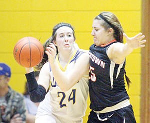 Lindsay Laws steals the ball from Kaitlyn Downey in first quarter vs. Troy, Jan. 2.