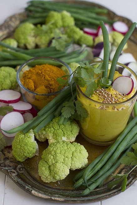 Or, if you and your friends are gathering in front of the television to watch the Oscars, consider trying this golden dip made with tahini (sesame paste) and honey. Set it on a platter of fancy crudite: blanched haricot verts, florets of neon green romanesco cauliflower, wedges of persimmon and kohlrabi, and paper-thin slices of watermelon radish.