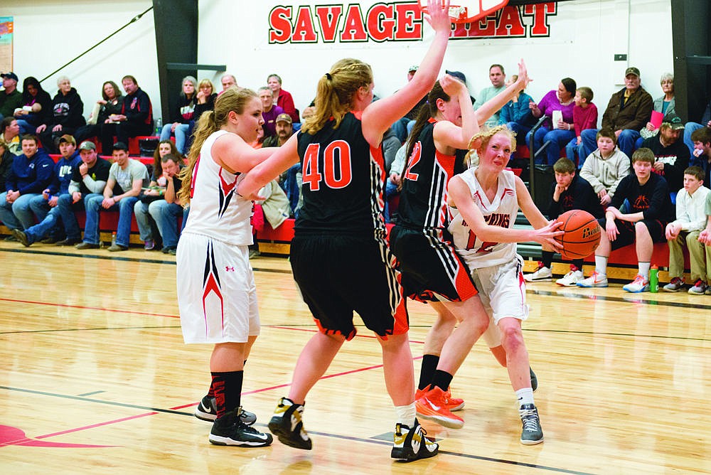 Pia Heggelund of the Lady Savage Heat fights through the Trotter defense.