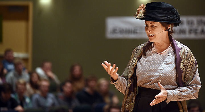 Mary Jane Bradbury gives a living history presentation of social reformer Jeannette Rankin at Glacier High School on Thursday, February 12. (Brenda Ahearn/Daily Inter Lake)