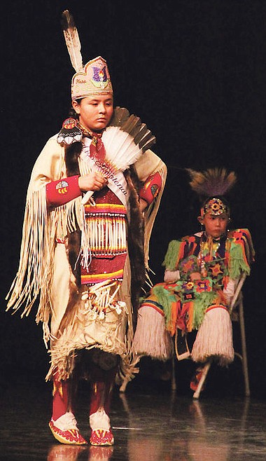 Audience members were treated to two types of traditional women’s dance regalia, with junior Miss Kootenai Marisa Shottanana-Ponce in buckskin and Liberty Cree in beaded regalia complete with long fringed shawl.