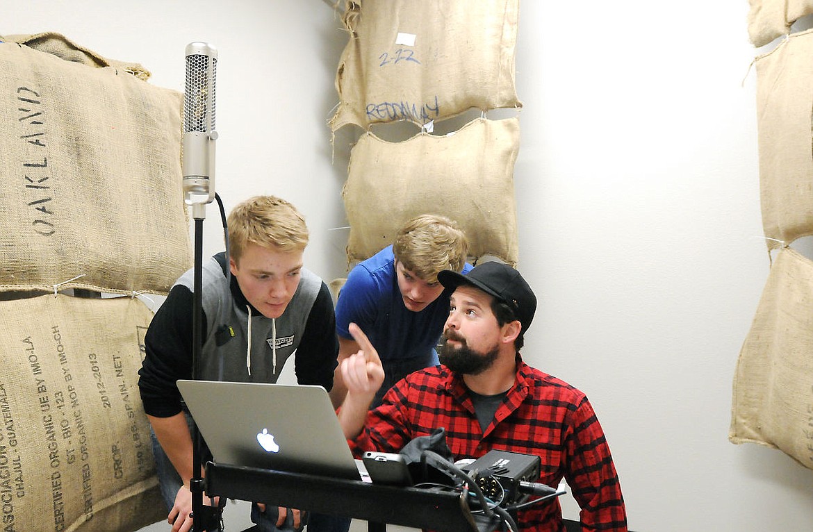 Brett Allen of Snowghost Music goes over the data of a sound test with Whitefish physics students Michael Voisin, left, and Travis Catina in a practice room in the the Center for Applied Media, Arts and Science on Tuesday. (Aaric Bryan/Daily Inter Lake)
