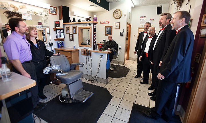 The barbershop quartet Classic Touch delivers a singing Valentine to Sue Greskowiak from her husband, Mike, at Artistic Barbering in downtown Kalispell on Friday morning. The quartet is made up of Ken Kauffman, Jeff Houston, Steve Kauffman and Duane Herriges.