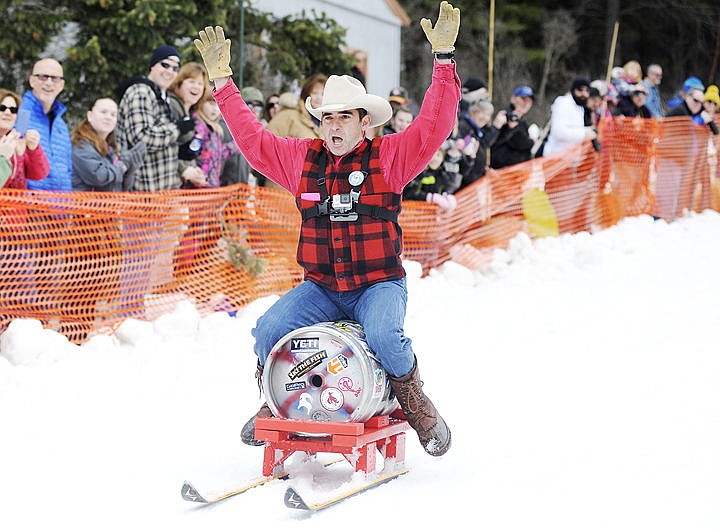 Mike Murray of Whitefish attempts to regain his balance during a heat of the Barstool Ski Races. It was Murray's seventh year competing in the event for Cabin Fever Days. Nearly 40 barstools were entered in the two-day event. The championship races will take place Sunday. (Aaric Bryan/Daily Inter Lake)