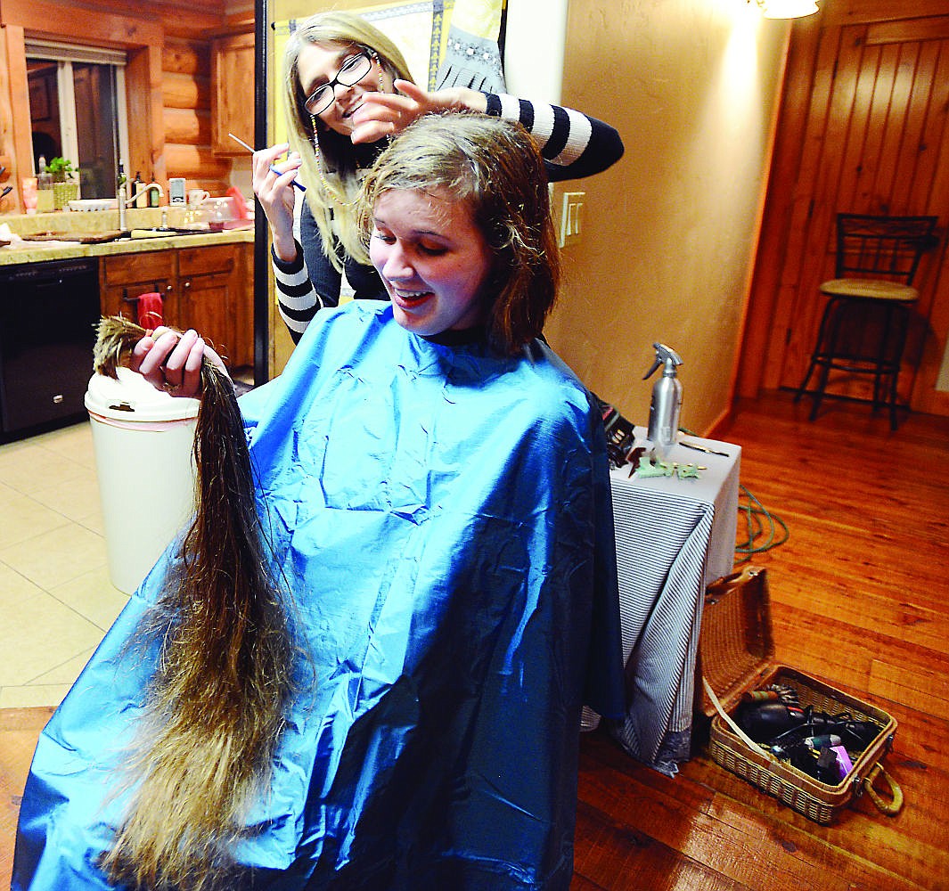 Marea Kotila has a shocked look on her face as she holds her 29-inch ponytail during her first hair cut on Feb. 6. She will be donating the 5 pounds, 3 ounces of hair to Pantene Beautiful Lengths, which provides free wigs to cancer patients.