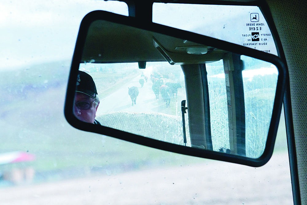 John Holland (in his truck) looks into his rear view mirror as he leads his cattle along.