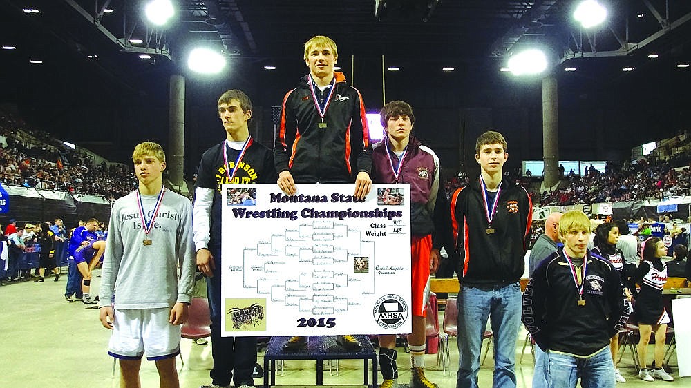 Plains-Hot Springs 145-pound wrestler, Russell Kujala stands on top of the podium following last weekend's B-C State Tournament in Billings. With the state championship, Kujala, a senior, became the first Savage Horsemen wrestler to win two state championships.