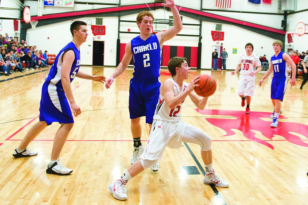 Trevor Paro passes two Charlo defenders to make a shot during Saturday night's game.