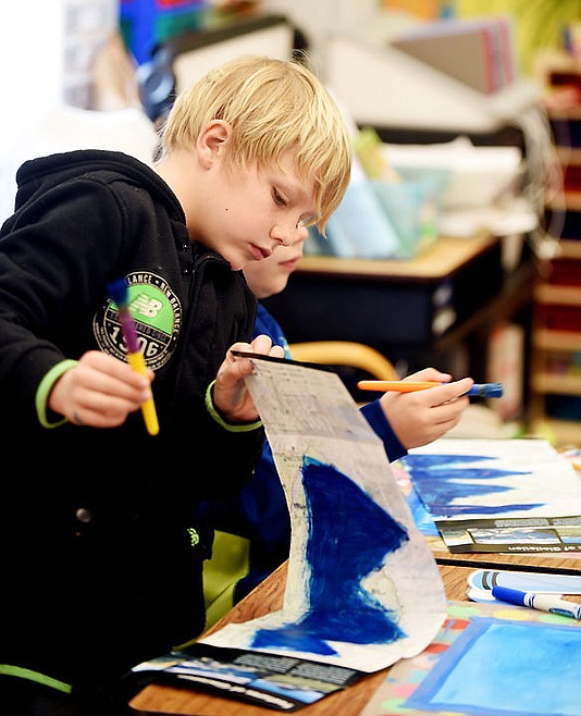Drake Meeker looks over his painted mountains on Thursday, February 19, in Elaine Holmquist's class at Hedges Elementary School. This monochromatic assignment incorporated different paints and papers and reflects what the students saw on a recent trip to Glacier National Park. (Brenda Ahearn/Daily Inter Lake)