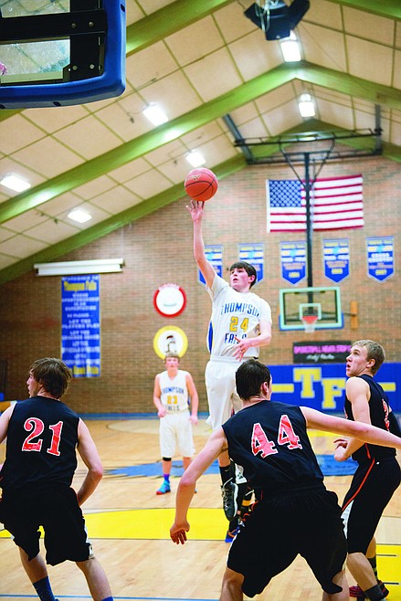 Dalton Hooten takes a jump shot during Thursday night's game in Thompson Falls.