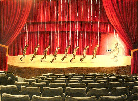 The piece depicts a stage with robots hanging from strings - puppet-like and lifeless - in a single line, facing a standing robot using scissors to cut the strings.