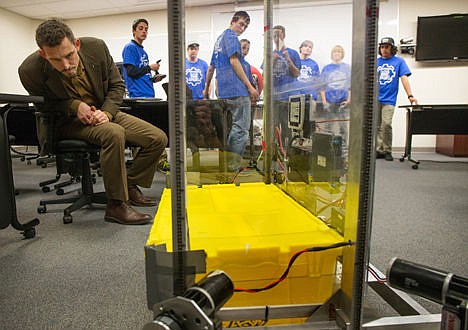 The FIRST (For Inspiration and Recognition of Science and Technology) robotics team presented its newest robot, "Calvin," during a presentation Wednesday evening in a University of Idaho Coeur d'Alene classroom in Harbor Center. The TeraViks will be heading to Calgary, Alberta, to showcase their moving-and-stacking-robot in the Western Canada FIRST Robotics Competition, April 1-4.
