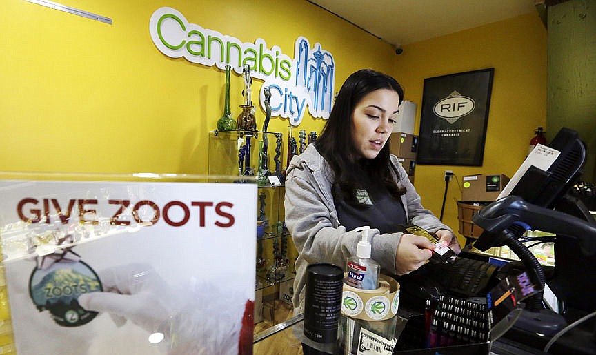 In this Tuesday, Dec. 30, 2014, photo, Cannabis City clerk Jessica Mann scans a customer's ID as she rings up a purchase of marijuana at the shop in Seattle. A year into the nation’s experiment with legal, taxed marijuana sales, Washington and Colorado find themselves with a cautionary tale for Oregon, Alaska or other states that might follow suit: They’re wrestling not with the federal interference many initially feared, but with competition from their own medical marijuana systems or even outright black market sales. (AP Photo/Elaine Thompson)