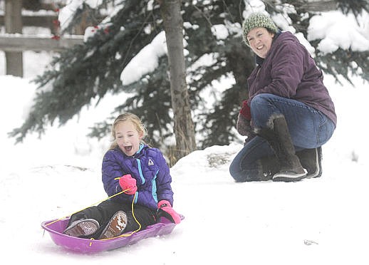 Marian Tuck screams while she sleds down a hill as her mom, Mary, watches at Woodland Park on Friday. More snow is on the way for sledding hills: A pair of storms heading for the Flathead Valley are expected to deliver a total of 5 to 10 inches of snow by Tuesday. (Aaric Bryan/Daily Inter Lake)