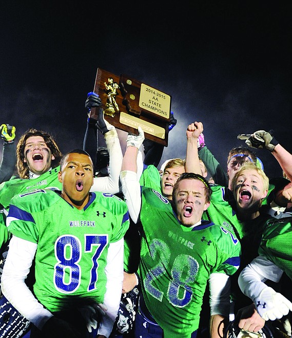 Glacier Wolfpack players celebrate their 56-19 victory over the CMR Rustlers to win the Class AA State Championship in Kalispell on Nov. 21, 2014. Players include Truman Pisk, Jacob Janke, Brady McChesney and Logan Jones. (Aaric Bryan/Daily Inter Lake)