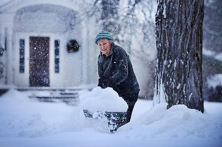 Valerie McGarvey of Kalispell digs out her sidewalks on Monday morning in downtown Kalispell. (Brenda Ahearn/Daily Inter Lake)