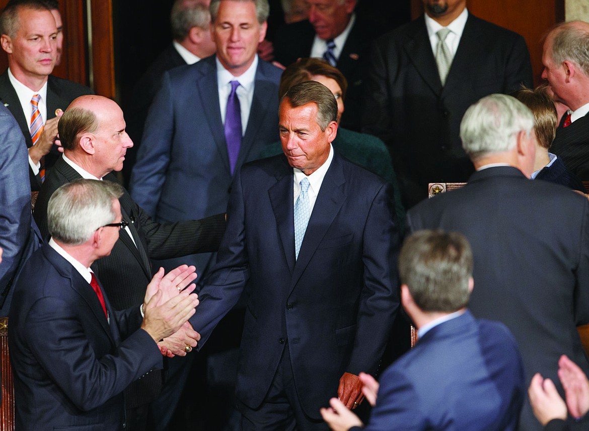 House Speaker John Boehner of Ohio is greeted by members of the House of Representatives at the opening session Tuesday of the 114th Congress after he was re-elected to his leadership post. (AP photo)