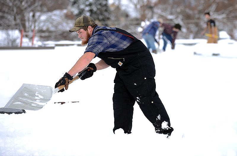Colt Oster of Bigfork, and the crew from Work Horse Construction clear snow from the 12,000 square foot roof of the Daily Inter Lake on Tuesday, January 6, in Kalispell. (Brenda Ahearn/Daily Inter Lake)
