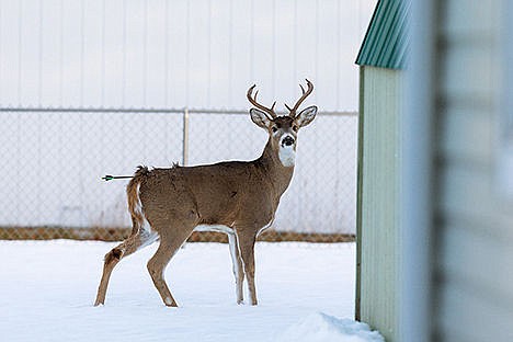 The 88-year-old Coeur d'Alene resident was alarmed to see a carbon fiber arrow protruding several inches from the backside of the frightened, four-point whitetail buck that has been living in his backyard.