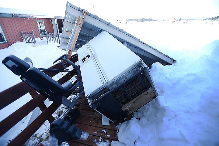 The front porch of the home of Jim and Allyson Kuechmann buried under snow and a collapsed roof on Friday, January 9, in Helena Flats. The roof came down on Tuesday afternoon around 3 p.m. (Brenda Ahearn/Daily Inter Lake)