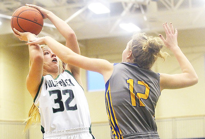 Glacier's Tessa Krueger shoots over Big Sky's Kendall Mooney after pulling down a rebound during the Wolfpack's 60-45 at Glacier on Saturday. (Aaric Bryan/Daily Inter Lake)