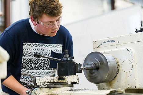 He held a strip of sandpaper taut in his hands Wednesday as he focused on smoothing one side of a robotics wheel he was making. Peering intently through his safety glasses at the circular aluminum piece spinning on the lathe, he explained that the wheel may be used in the First Robotics Challenge. Or, he may just take it home to add to his portfolio.