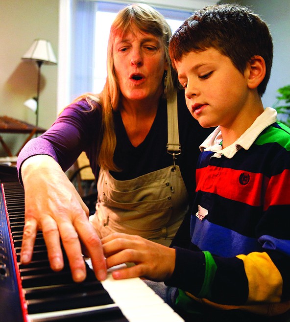 Sarah Burdick, left, works with Vincent Meccia, 8, on a song he is learning on the piano.