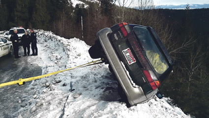 A Subaru Outback went off the side of Schweitzer Mountain Road and wound up balancing precariously on its passenger side. Had its resting angle been a few degrees greater, Schweitzer Fire/Rescue District Chief Spencer Newton said the vehicle would have rolled.
