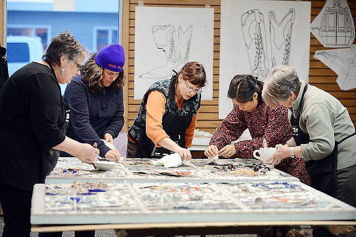 From left: Deb Stika, Paual Greenstein, Amy Mow, Yuko Gaikowski and Nancy Svennungsen polish and seal the final Window on Whitefish mosaic on Thursday, January 15. The finished piece will be revealed at the Whitefish Winter Carnival. (Brenda Ahearn/Daily Inter Lake)