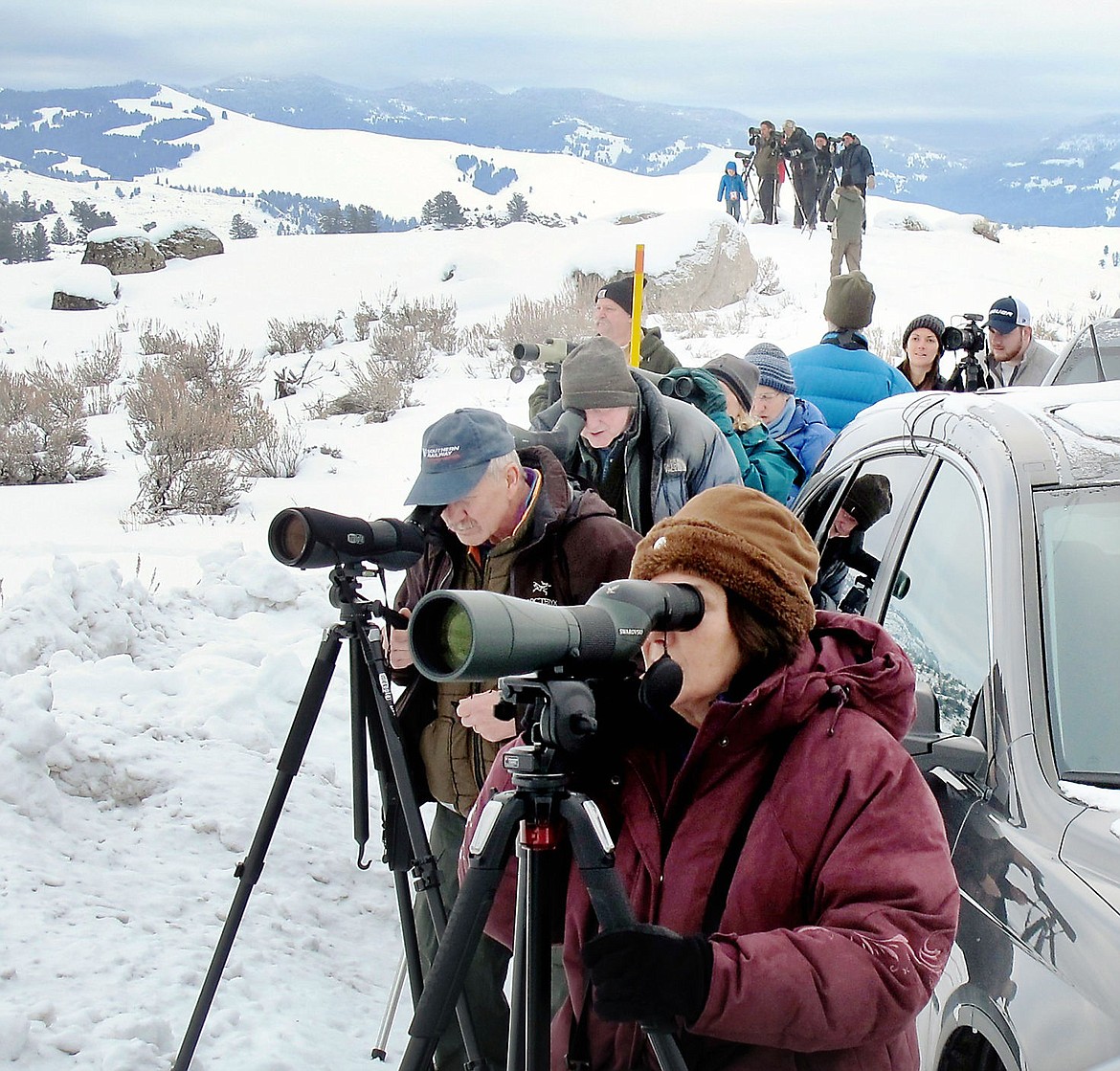 “This is a great day,” said Char Thompson of Eugene, Oregon, as she manned her spotting scope on a snowy hill near Junction Butte to watch the nearby wolves. “To have interaction and so close.”