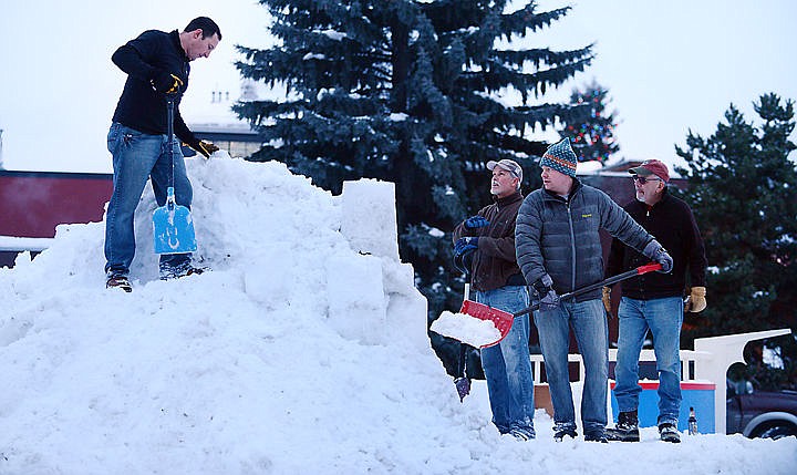 From left: Josh Akey, Mark Johnston, Luke Walrath, and Mark Svenngunsen transform the piled up snow in downtown into the throne for the coronation of the king and queen at the upcoming Whitefish Winter Carnival. The front of the throne, shaped like the prow of a ship, was built by Svenngunsen for the Whitefish Theatre Compay's production of the King and I. (Brenda Ahearn/Daily Inter Lake)