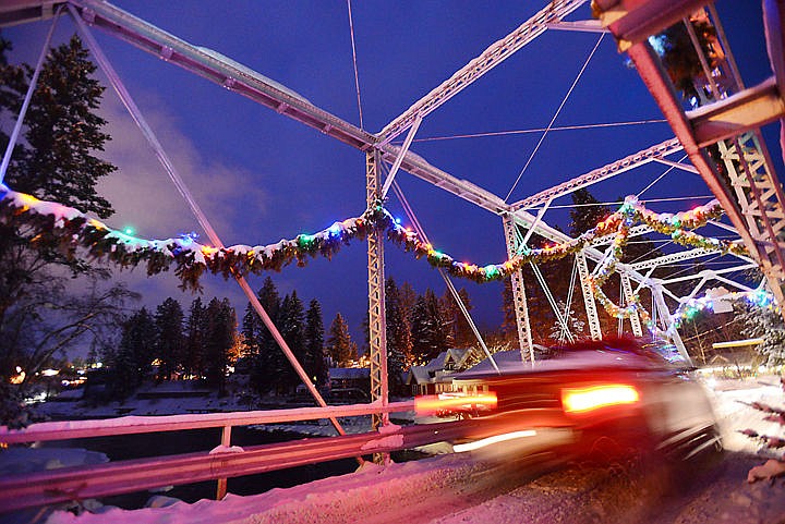 The bridge over the Swan River lights up in the snow against the evening sky on Monday in Bigfork. The town is still decorated with just under 12,000 feet of handmade garlands and lights. The decorations are slated to be taken down Jan. 31. Those interested in helping out with this community event should call the Bigfork Chamber of Commerce at 837-5888.