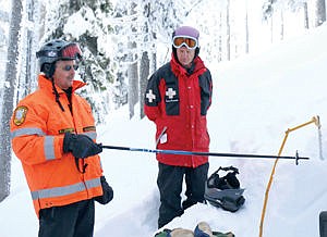 Ralph Lippert uses his ski pole to inquire about snow pack specifics during the avalanche workshop on Turner Mountain. Ski Patrol volunteer Steve Lefever is seen in the background.