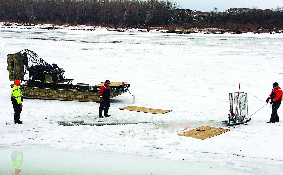 Cleanup workers cut holes in the ice on the Yellowstone River near Crane, Montana, on Monday as part of efforts to recover oil from a pipeline spill that released up to 50,000 gallons of crude oil. (AP photo)