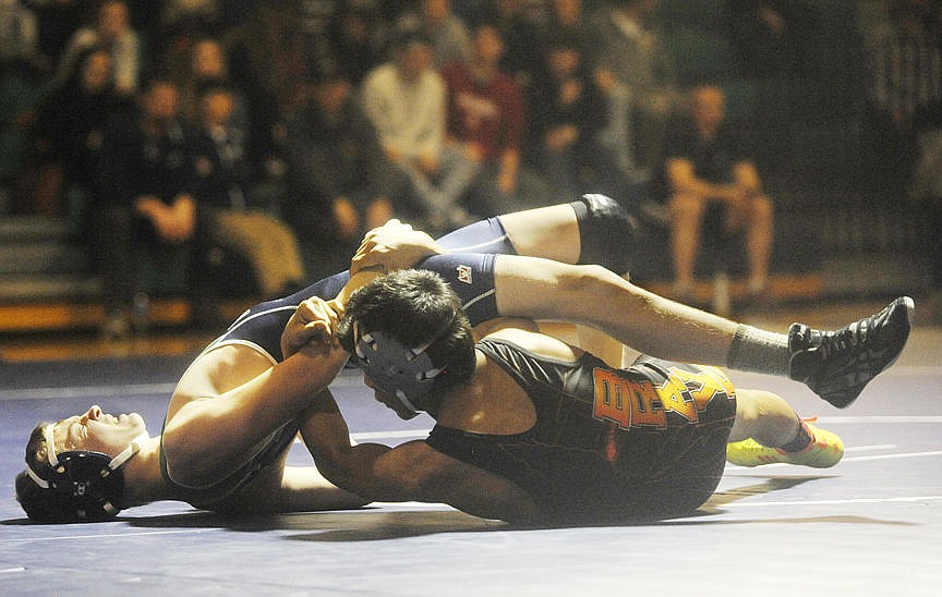 Flathead's Trae Vasquez gets near-fall points on Billy Barrett during the 113-pound match at the 2015 crosstown dual on January 22 at Glacier. Vasquez pinned Barrett in the first round. (Aaric Bryan/Daily Inter Lake)