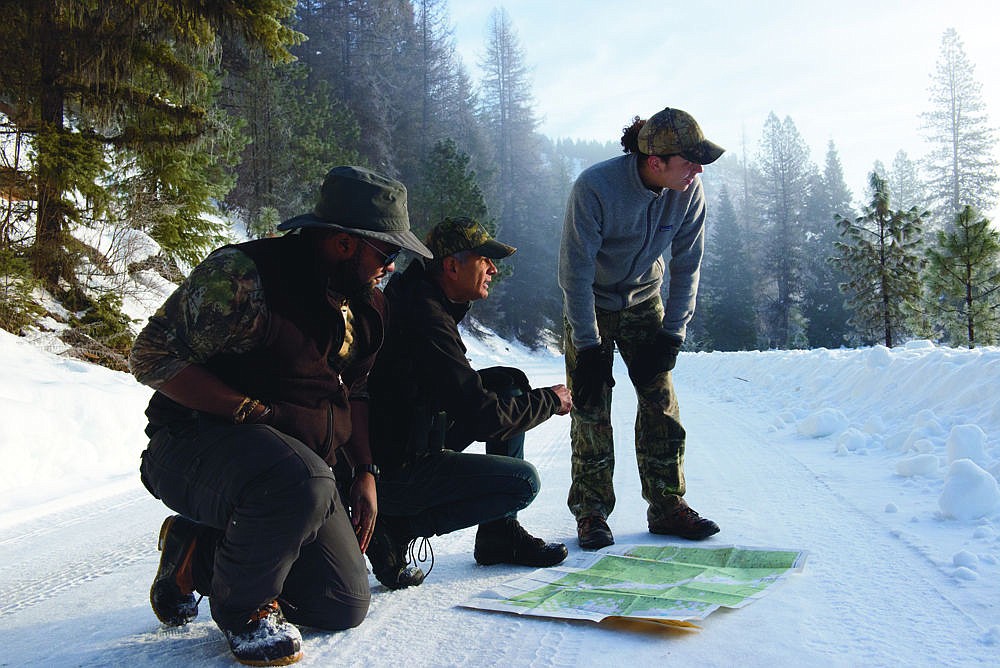 From left to right Clarence Gilmer II, Rod Coronado and Matt Almonte of Wolf Patrol plan out their day over the weekend outside of Trout Creek.