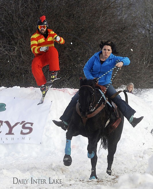 Bart Slaney hits the final jump as he is being pulled by Kristen House on Roxi during the sport division of the 11th annual World Skijoring Championship in Whitefish on Saturday.