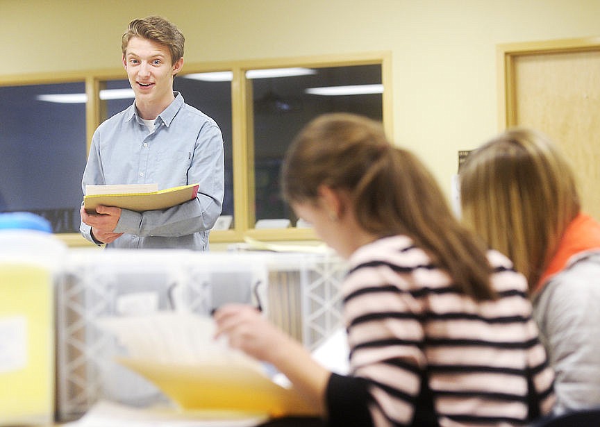Ryker McIntyre practices his speech as Emma Trunkle and Jenna McCrorie look over their notes during a speech and debate practice at Glacier High School on Tuesday.