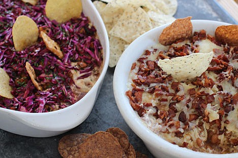 For the New England Patriots, we have barbecued pulled pork topped with skillet sauteed apples and butter. Over that is a thick layer of cream cheese and baked beans, then a final layer of bacon and extra-sharp Vermont cheddar cheese. For the Seattle Seahawks, we start with teriyaki-seasoned Dungeness crabmeat, then add layers of creamy cheese, caramelized onions and smoked mussels, and finish with purple cabbage slaw and blackberry vinaigrette.