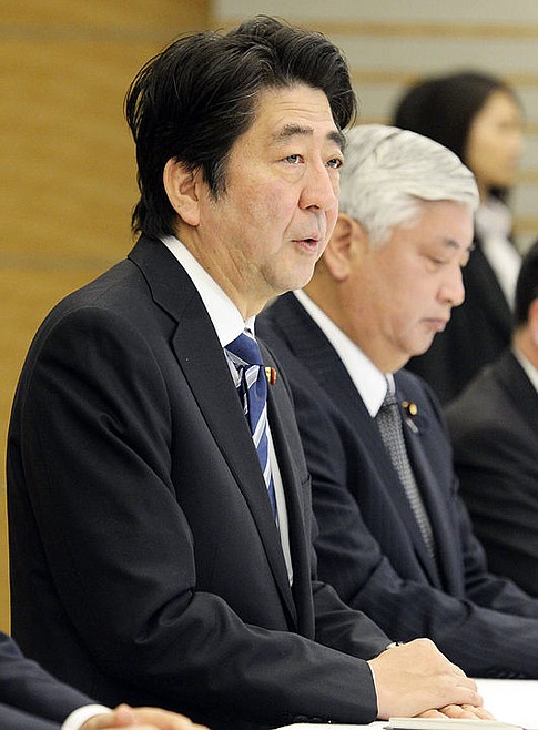 Japanese Prime Minister Shinzo Abe, left, speaks during an emergency Cabinet meeting at the prime minister's official residence in Tokyo Sunday, Feb. 1, 2015 after an online video released Saturday night purported to show an Islamic State group militant beheading Japanese journalist Kenji Goto. (AP Photo/Kyodo News) JAPAN OUT, MANDATORY CREDIT